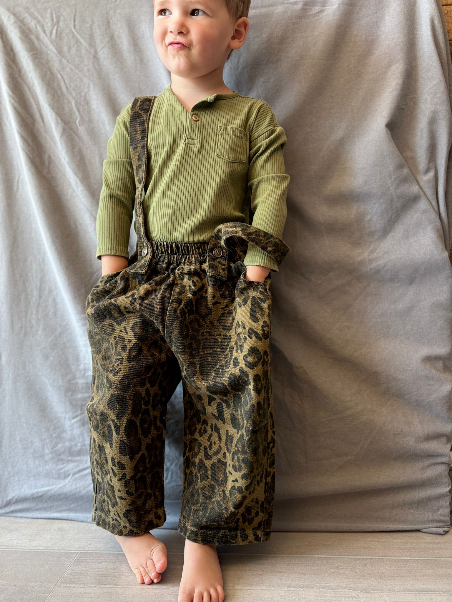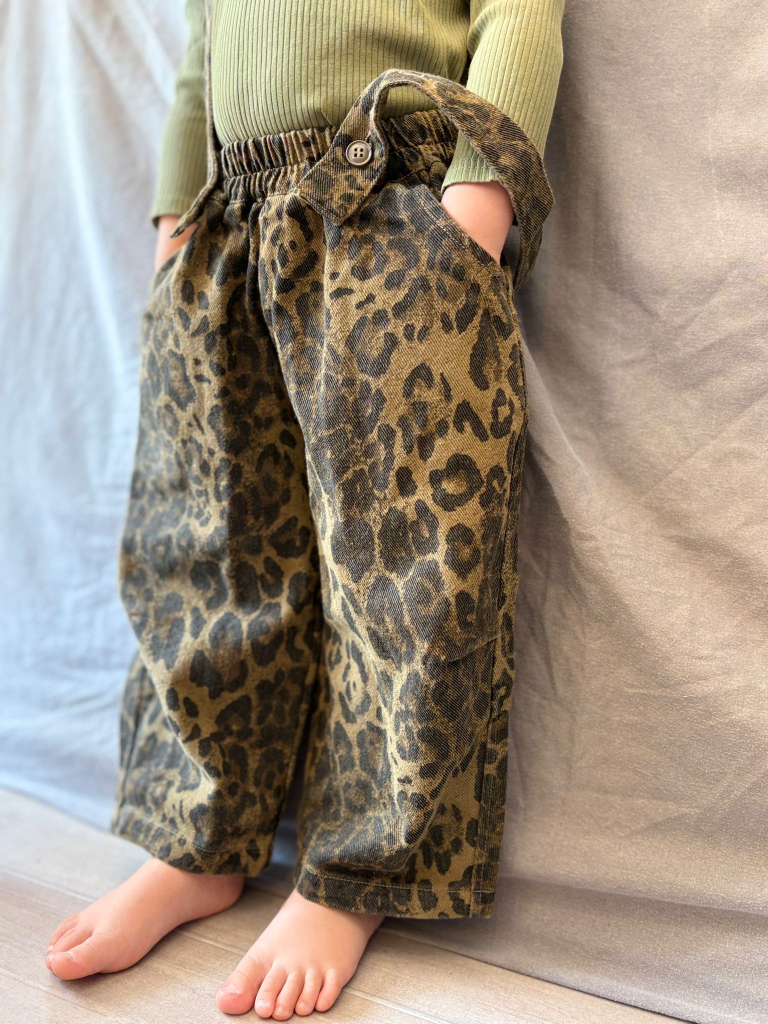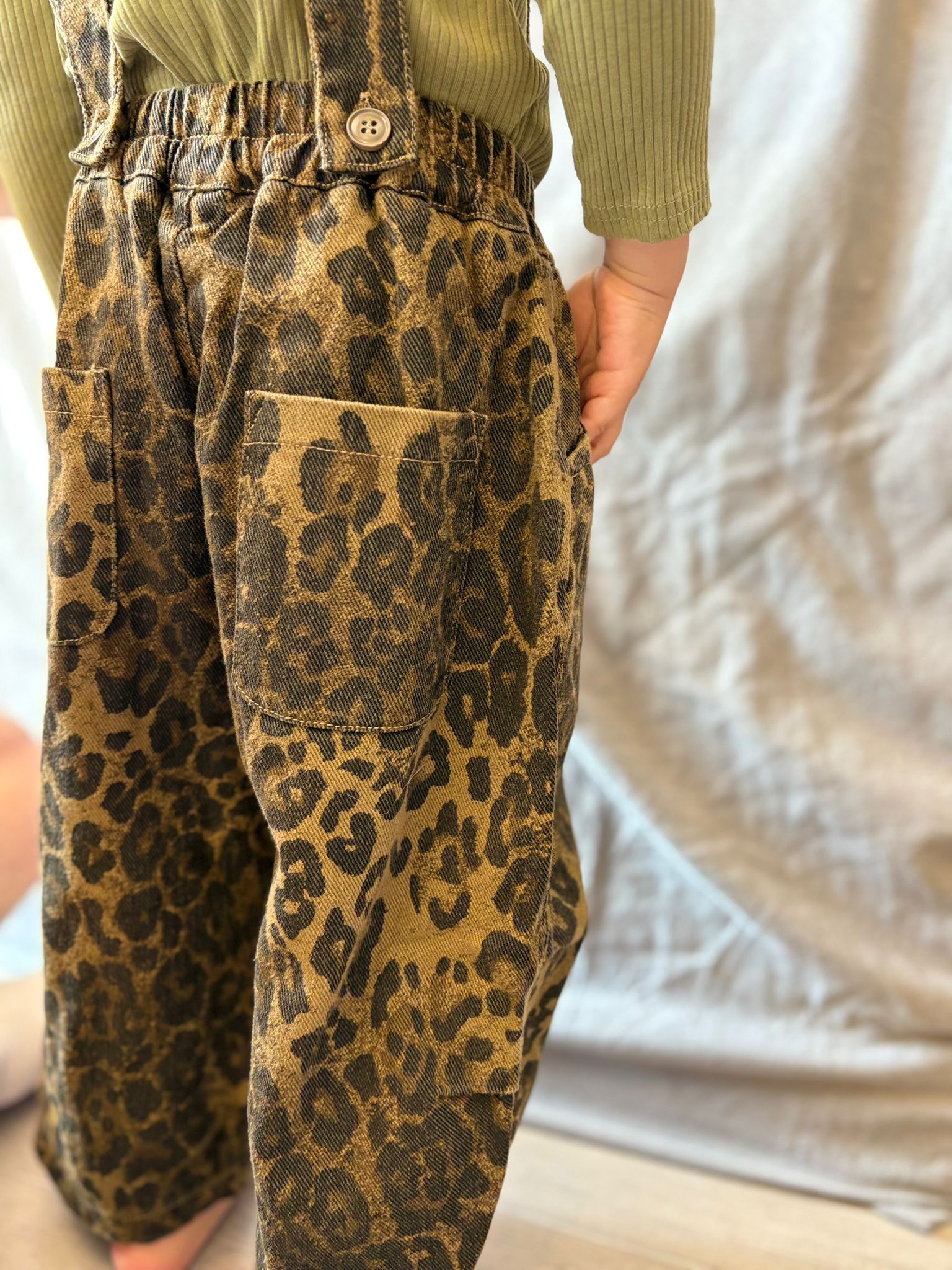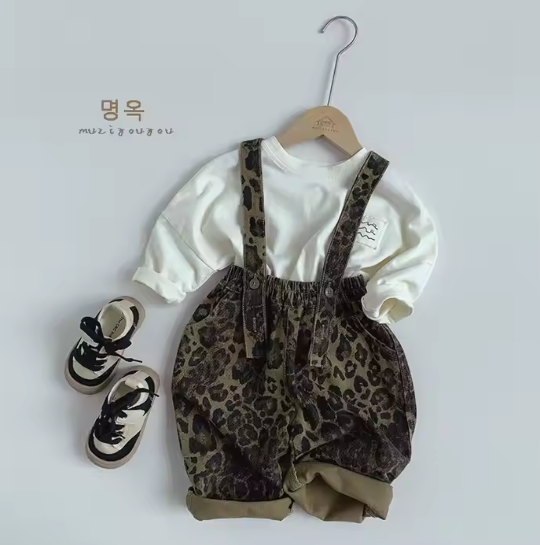 These children's leopard print trouser dungarees are made from 100% cotton, ensuring breathability and anti-pilling. They feature a stylish a printed pattern and anti-wrinkle design, offering both style and comfort for casual wear.